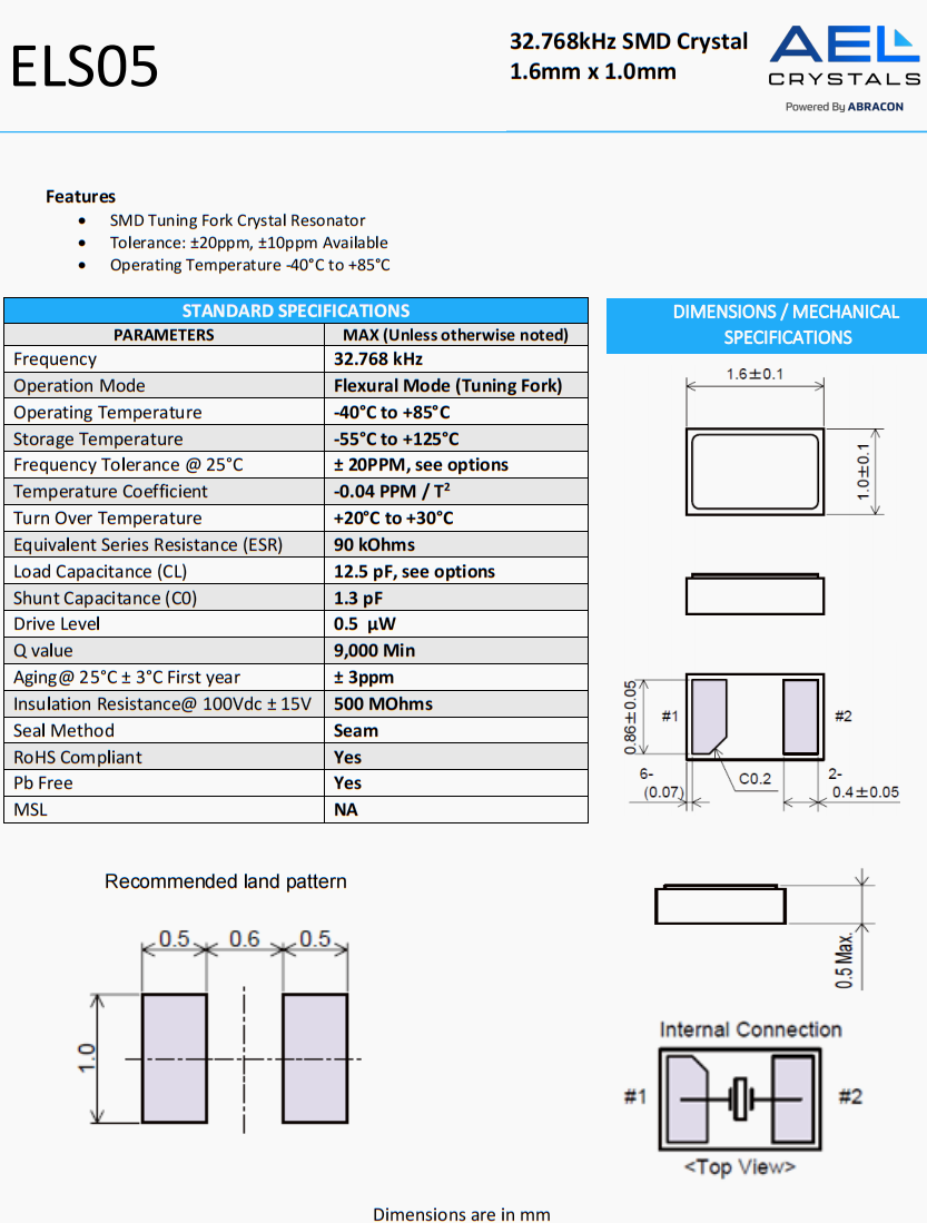 | ELS05-32.768kHz-9-T | AEL Crystals | ELS05 | 32.768 kHz | ±20ppm | 9 pF | |