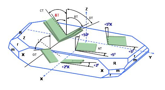 依據(jù)不同的應(yīng)用領(lǐng)域及工作溫度需求, 因應(yīng)了許多不同的石英切割角度種類. 例如AT-, BT-, CT-, DT-, NT, GT…..等不同的切割板片. 不同的切割方向的板片具有不同的彈性常數(shù)張量(elastic constant tensor), 不同的壓電常數(shù)張量(piezoelectric constant tensor)及不同的介電常數(shù)張量(dielectric constant tensor). 這些張量在石英組件的設(shè)計(jì)及應(yīng)用上展現(xiàn)了不同的振蕩及溫度特性. (圖三)表現(xiàn)了在Z-plat石英結(jié)構(gòu)上,幾種不同方向的石英板片切割方式.