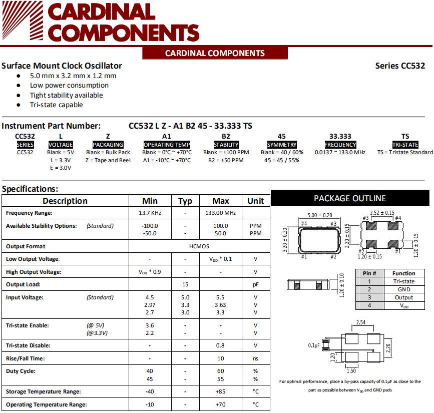 Cardinal晶振,CC532晶振,石英晶體振蕩器.5032mm體積的石英晶體振蕩器有源晶振,改產(chǎn)品可驅(qū)動(dòng)2.5V的溫補(bǔ)晶振,壓控晶振,VC-TCXO晶體振蕩器產(chǎn)品,電源電壓的低電耗型,編帶包裝方式,可對(duì)應(yīng)自動(dòng)高速貼片機(jī)自動(dòng)焊接,及IR回流焊接(無(wú)鉛對(duì)應(yīng)),為無(wú)鉛產(chǎn)品,超小型,質(zhì)地輕.產(chǎn)品被廣泛應(yīng)用到集成電路,程控交換系統(tǒng),無(wú)線發(fā)射基站.