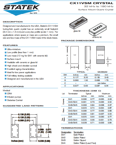 1970年,Statek晶振公司開創了石英計時元件小型化技術,革新了頻率控制行業.今天,Statek進口晶振在設計和制造超微型石英晶體,振蕩器和傳感器方面延續了創新的傳統.自成立以來,Statek一直是創新,服務和質量的代名詞.所有產品都是在美國設計制造和測試的.
