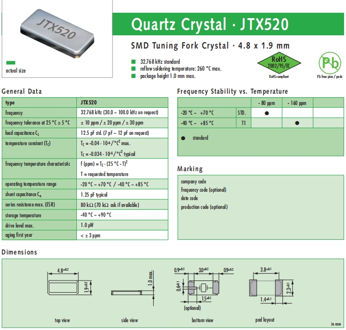 JAUCH晶振,JTX520晶振,高性能石英晶體.貼片晶振本身體積小,超薄型石英晶體諧振器,特別適用于有目前高速發(fā)展的高端電子數(shù)碼產(chǎn)品,因?yàn)榫д癖旧硇⌒突枨蟮氖袌?chǎng)領(lǐng)域,小型,薄型是對(duì)應(yīng)陶瓷諧振器(偏差大)和普通的石英晶體諧振器(偏差小)的中間領(lǐng)域的一種性價(jià)比較出色的產(chǎn)品.產(chǎn)品廣泛用于筆記本電腦,無線電話,衛(wèi)星導(dǎo)航HDD, SSD, USB, Blu-ray等用途,符合無鉛焊接的高溫回流焊曲線特性.