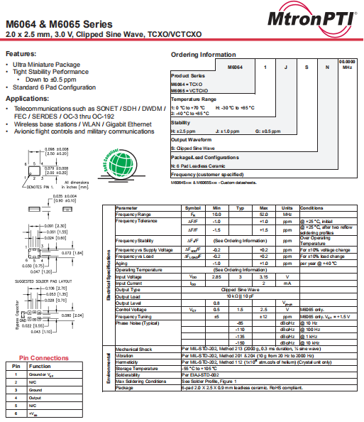 MTRONPTI晶振,M6065晶振,VC-TCXO晶振.2520mm體積的晶振,可以說是目前小型數(shù)碼產(chǎn)品的福音,目前超小型的智能手機(jī)里面所應(yīng)用的就是小型的石英晶振,該產(chǎn)品最適用于無線通訊系統(tǒng),無線局域網(wǎng),已實(shí)現(xiàn)低相位噪聲,低電壓,低消費(fèi)電流和高穩(wěn)定度,超小型,質(zhì)量輕等產(chǎn)品特點(diǎn),產(chǎn)品本身編帶包裝方式,可對應(yīng)自動(dòng)高速貼片機(jī)應(yīng)用,以及高溫回流焊接(產(chǎn)品無鉛對應(yīng)),為無鉛產(chǎn)品.