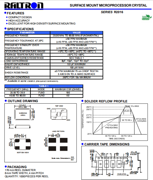 Raltron晶振,R2016晶振,石英晶體諧振器.貼片石英晶體,體積小,焊接可采用自動貼片系統,產品本身小型,表面貼片晶振,特別適用于有小型化要求的電子數碼產品市場領域,因產品小型,薄型優勢,耐環境特性,包括耐高溫,耐沖擊性等,在移動通信領域得到了廣泛的應用,晶振產品本身可發揮優良的電氣特性,滿足無鉛焊接的高溫回流溫度曲線要求.