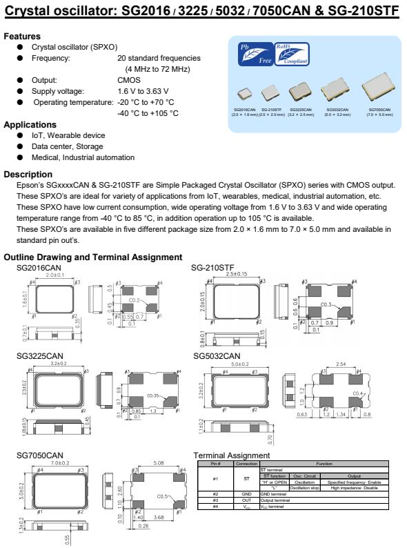 愛普生的SGxxxxCAN和SG-210STF是具有CMOS輸出的簡(jiǎn)單封裝晶體振蕩器(SPXO)系列。這些SPXO是物聯(lián)網(wǎng)、可穿戴設(shè)備、醫(yī)療、工業(yè)自動(dòng)化等各種應(yīng)用的理想選擇。這些SPXO有源晶振具有低電流消耗,寬工作電壓從1.6 V到3.63 V,寬工作溫度范圍從-40°C到85°C,另外可操作到105°C。這些SPXO的可在五種不同的包裝尺寸從2.0 × 1.6毫米到7.0 × 5.0毫米,可在標(biāo)準(zhǔn)針的。