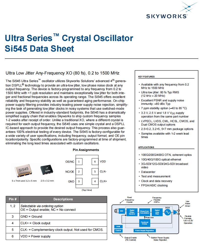 | 545BAA200M000BBG | Skyworks晶振 | Si545 | 200 MHz | LVDS | 1.8V, 2.5V, 3.3V | ±20ppm |