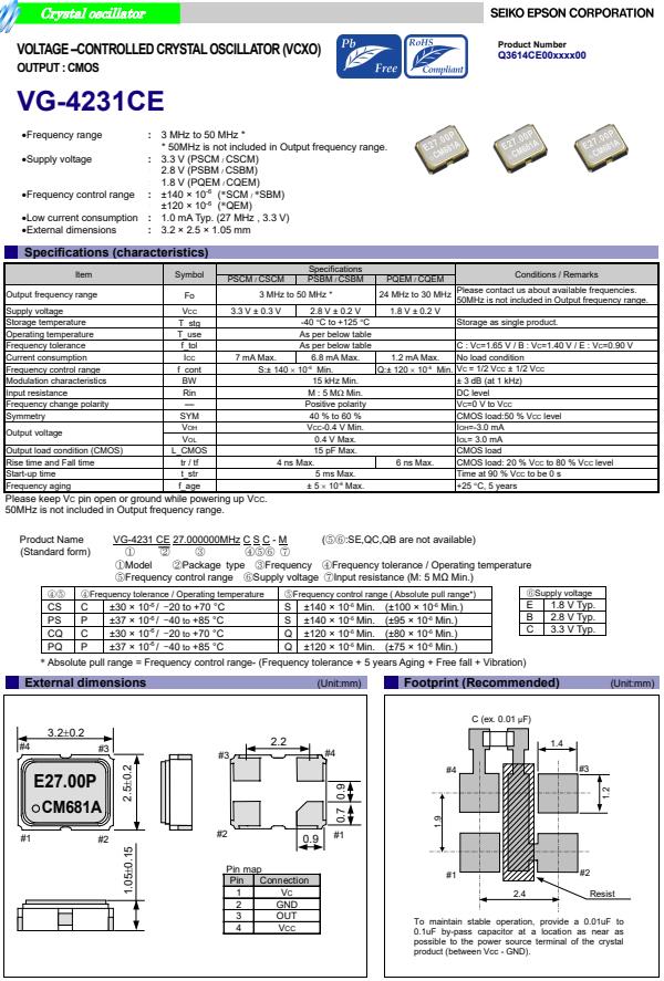 | Q3614CE00001100 | VG-4231CE | 27.000000 MHz | PSC-M | 3.20 x 2.50 x 1.05 mm | CMOS | 3.000 to 3.600 V | 1.65 +/-1.65V | +/-95 ppm | +/-140 ppm | -40 to 85 °C |