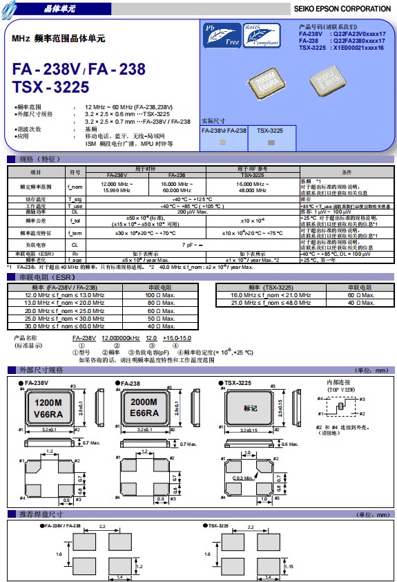 日本愛普生晶振TSX3225,是一款小體積晶振尺寸3.2x2.5mm無源晶振,石英晶體諧振器,四腳貼片晶振,具有超小型輕薄型,耐高溫,耐熱及耐環(huán)境特性,該產(chǎn)品已被確定的高信賴性最適合用于汽車電子部件,導(dǎo)航、遠(yuǎn)程呼叫、緊急救援、防盜跟蹤、道路救援、電話、資訊娛樂,自動駕駛等等,為了實現(xiàn)人與汽車系統(tǒng)自由的交互,并提供實時的信息互動、交通、天氣等功能,汽車對車規(guī)級晶振的依賴只會越來越強(qiáng)。在極端嚴(yán)酷的環(huán)境條件下也能發(fā)揮穩(wěn)定的起振特性,工作溫度要達(dá)到-40到+85℃(+105℃),常見的3225封裝貼片晶振FA-238A、TSX-3225、FA-238V/FA-238等.
