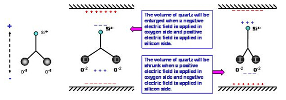 "SG-310SCF 25.0000MB3", 石英材料中的二氧化硅分子(SiO2) 在正常狀態下, 其電偶極是互相平衡的電中性. 在(圖二左)的二氧化硅是以二維空間的簡化圖形. 當我們在硅原子上方及氧原子下方分別給予正電場及負電場時, 空間系統為了維持電位平衡, 兩個氧原子會相互排斥, 在氧原子下方形成一個感應正電場區域, 同時在硅原子上方產生感應負電場區域. 相反的情況, 當我們在硅原子上方及氧原子下方分別給予負電場及正電場時, 兩個氧原子會相互靠近, 氧原子下方產生感應負電場,硅原子上方產生感應正電場. (圖二). 然而, 氧原子的水平位置變化時, 鄰近的另一個氧原子會相對的產生排斥或吸引的力量, 迫使氧原子回到原來的空間位置. 因此, 電場的力量與原子之間的力量會相互牽動, 電場的改變與水平方向的形變是形成交互作用狀態. 這個交互作用會形成一個在石英材料耗能最小的振動狀態, 祇要由電場持續給與能量, 石英材料就會與電場之間維持一個共振的頻率. 這個壓電效應下氧原子的振幅與電場強度及電場對二氧化硅的向量角度有相對應的關系.在實際的應用上, 電場是由鍍在石英芯片上的金屬電極產生, 電場與二氧化硅的向量角度則是由石英晶棒的切割角度來決定.