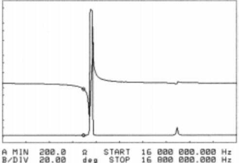 圖4 :(大約)16 MHz CX-4(使用HP 4194A獲得)的阻抗與頻率的關系。 請注意,在此特定設計中缺少任何重要的非諧波模式。