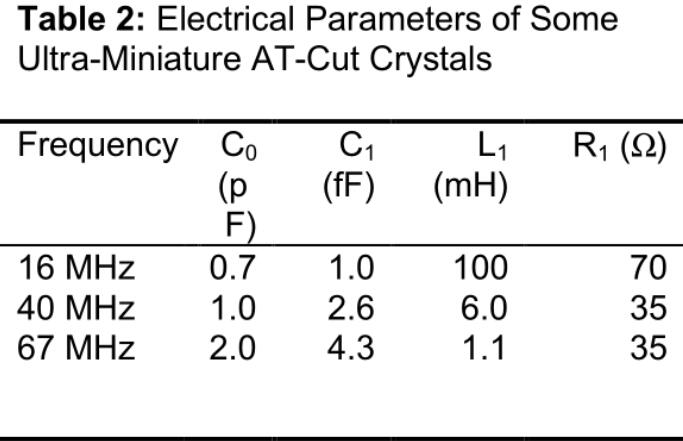 回想一下,晶體的隔離模式在電學上建模為電容C 0與電感L 1,電容C 1和電阻R 1的串聯組合并聯。區別在于,超小型AT晶體與較大的弟兄們之間的區別是較大的串聯電阻R 1和較小的串聯電容C 1(兩者都是由于電極的面積較小[3])。在表2中,我們給出了三個不同頻率的三個CX-4 AT晶體的電參數。使用這些值計算它們較大的CX-1對應物的值(此處未給出),我們發現R 1約為其較大的CX-1對應物的電阻的2至3倍,而C 1大約為二分之一至三分之一CX-1的值。