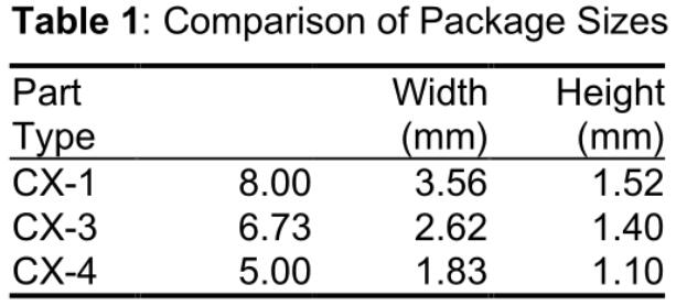 AT切割石英晶體諧振器已經在精密的頻率控制產品中使用了60多年,并且今天已成為使用最廣泛的晶體類型之一。盡管傳統的AT晶體是圓盤形的,但對于更小的元器件的需求導致了微型AT條紋的發展。為了滿足制造商對于更小組件的需求,Statek Corporation開發了超小型低剖面薄型石英晶振,作為其CX-4系列產品的一部分。為了進行比較,CX-4晶振僅需要CX-1晶體的三分之一的土地面積和CX-3石英晶振的一半的土地面積。 (請參閱表1和圖1。)